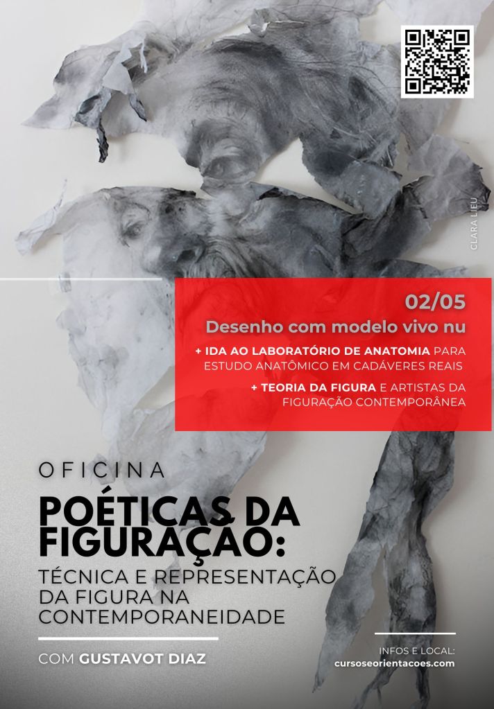 A aula faz parte da OFICINA “Poéticas da Figuração” que está com as últimas vagas disponíveis. O curso envolve conteúdo presencial de 6h de técnicas e procedimentos do desenho da Figura Humana, incluindo 2h de poses com modelo vivo!